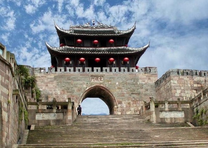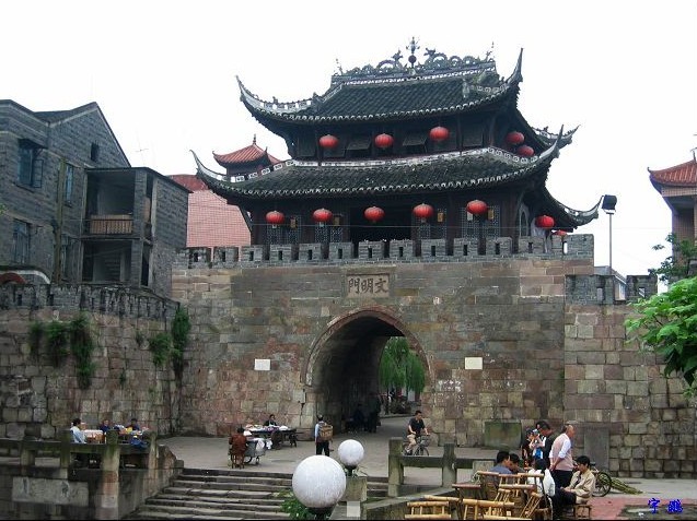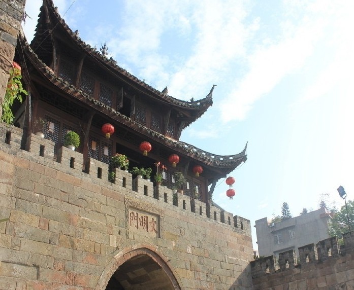 长送大江奔大海,并偕罐口输银,云台赠翠,九龙起舞,双塔题诗,一道宏门开朗抱; 更留佳话赞佳乡,且说弼臣挥翰,邓氏献方,朱德讨袁,炳文救国,几多豪杰出仙源。 文明门城楼城墙位于区城南大街,是长江边上迄今保存最为完整的城楼城墙,素有“万里长江第一门”之称。城墙原为土筑,明天顺年间改为石城墙,清顺治三年(1674年)城墙遭破坏。乾隆二十九年(1764年)整修时,增设城门两道。原有九道城门中,现存临长江的“文明门”(俗称大南门)、“广福门”、“望瀛门”(俗称东门)城楼及沿江部份城墙,全长1482米,高约6米,平均厚7.5米。
