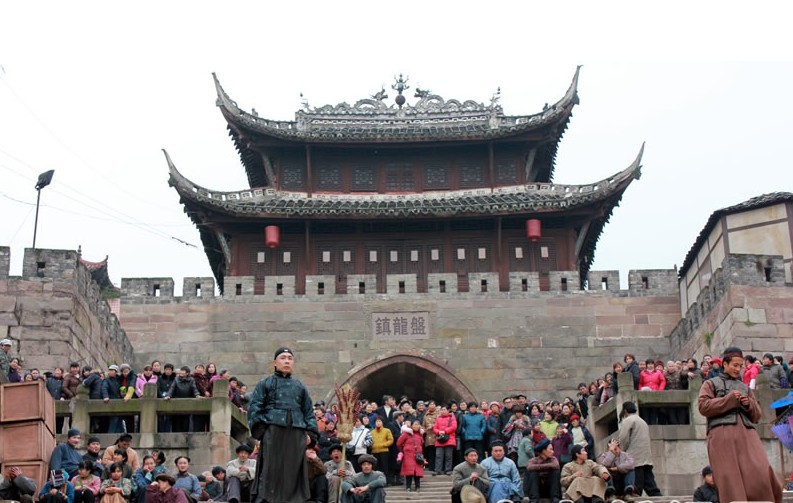 “文明门”城楼,建于清乾隆二十九年(1764年),重檐歇山式项,穿逗抬梁混合梁架。清嘉庆十一年(1807年)培修时;知县邵兆禄书“文明门”三字刻于门额上,整个建筑翼角高翘、曲线优美、秀顷大方、不落俗套,属川南民间风格。楼前有6台62级石质码头与之相连,使城楼更加巍峨壮观、气度非凡。先后被《草莽英雄》、《自古英雄出少年》、《九根毛》、《青年刘伯承》等多部电影电视剧摄入。 “拍电影--当主角”