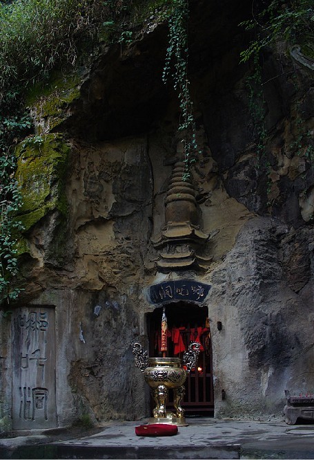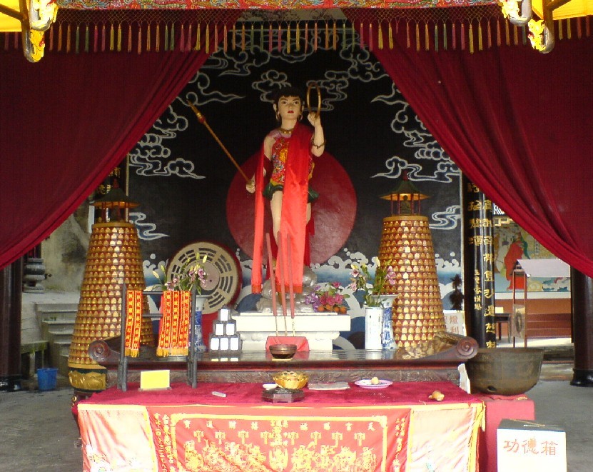 哪吒庙 哪吒行宫位于四川省宜 宾市翠屏山,占地2000平方米,由山门、太子殿、哪吒洞三部分组成。这里古木葱郁,风景绝佳,是中国著名的城市森林公园。通过海峡两岸的共同考证,认定翠屏山的哪吒行宫为中国唯一的哪吒(三太子)祖庙,每年来此寻根祭祖的港澳台同胞及东南亚侨胞络绎不绝。1998年哪吒行宫应邀赴台访问,三太于金身绕台岛半年,突出了祖庙地位,2000年来翠屏山观光进香祭拜的台胞人数递增了40%。据台湾宗教管理部门公布的统计资料:台湾有各种宗教寺庙,教堂约两万座,登记有案的寺庙有9225座,其中道教官庙7289座,占79%,它们都分别以主、次神的关系供奉着三太子,而主把神是哪吁(三太子)即中擅元帅的宫庙就达二千余座,有三太子信徒600余万人,占台湾人口的 2 5%。凡来祖庙祭拜的台胞有一习俗就是要连续进香三年,因此在台湾有较为固定的巨大客源市场。宜宾除三大于祖庙外,还有太子石、龙骨石、天池、还生阁、金光洞、陈塘关等多处三太子足迹。 哪吒行宫外景 神奇的哪吒洞