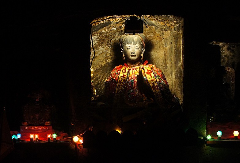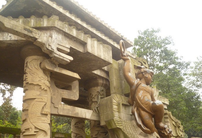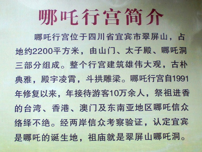 哪吒庙 哪吒行宫位于四川省宜 宾市翠屏山,占地2000平方米,由山门、太子殿、哪吒洞三部分组成。这里古木葱郁,风景绝佳,是中国著名的城市森林公园。通过海峡两岸的共同考证,认定翠屏山的哪吒行宫为中国唯一的哪吒(三太子)祖庙,每年来此寻根祭祖的港澳台同胞及东南亚侨胞络绎不绝。1998年哪吒行宫应邀赴台访问,三太于金身绕台岛半年,突出了祖庙地位,2000年来翠屏山观光进香祭拜的台胞人数递增了40%。据台湾宗教管理部门公布的统计资料:台湾有各种宗教寺庙,教堂约两万座,登记有案的寺庙有9225座,其中道教官庙7289座,占79%,它们都分别以主、次神的关系供奉着三太子,而主把神是哪吁(三太子)即中擅元帅的宫庙就达二千余座,有三太子信徒600余万人,占台湾人口的 2 5%。凡来祖庙祭拜的台胞有一习俗就是要连续进香三年,因此在台湾有较为固定的巨大客源市场。宜宾除三大于祖庙外,还有太子石、龙骨石、天池、还生阁、金光洞、陈塘关等多处三太子足迹。 哪吒行宫外景 神奇的哪吒洞