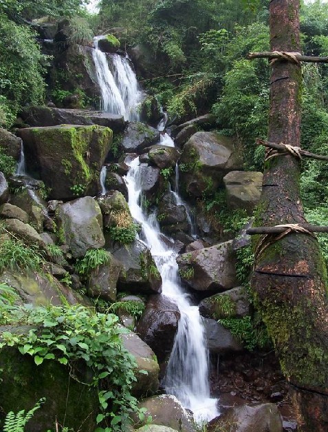 1、沧背水(千米瀑布群)景区 这个景区从水冲坝到天门树,区域面积约10平方公里,属于四川盆地南缘与云贵高原的过渡地带,亚热带原始阔叶林层状分布特征明显,森深茂密,水源涵养好,形成了一道奇丽的瀑布;珍稀植物(木+共)桐随处可见。简直是奇水纵横,奇树满山,奇石遍地,有着峨眉的秀,青城山的幽。 沧背水是大雪山的核心景区,在大雪山主峰右侧。涓涓细流,从高山密林中流出,在三口塘汇聚,通常以每秒达0.3―0.5立方米的流量,从三口塘顺着35度―42度的陡岩倾泻而下,一叠再叠,短则几米,长则上百米,构成长达1100多米、千姿万态的瀑布群。它每流经每一处,就在那里形成一个天然景点。这是一道难得的自然奇观,错过了实在是人生一大遗憾,大家请跟随我,从三口塘下行,沿着瀑布流径观赏。 “三口塘”是第一个景点。基岩上有三个大小基本相同的水塘,色深如黛,深不见底,当地人称为“三口塘”。如果大家有兴趣,皓月当空时来,可以同时看到三个月亮。所以这里也叫“三潭映月”。 第二个景点是“梯子瀑布”。地形由高到低,形成多道石坎,水流从石坎上溢过流下,一迭一迭形同梯子,美丽壮观。 知道什么是“人间仙境”吗?这里的环境特别优美,极目远眺,群山秀色次弟入望;置身茂林,鸟鸣啁啾,流水潺潺,如听一曲舒缓悦耳的人间天籁,这就是“人间仙境”。 大家说右对侧悬岩上的那些大小不同的石头,像不像青蛙?它们望着这里倾泻而下的瀑布,所以叫“青蛙观瀑”。 这股水叫“万马归槽”。分开的急流又逐渐紧收,形同天然的马帮归队,一泻入槽,奔腾直下。 这里地形如盆底,乱石缝中生长出多种灌木和草本植物,春天来了,百花争艳,像一个天然盆景镶嵌在瀑布辟中。称它为“天然盆景”,大家想来是会举手赞同的。 “珍珠瀑布”很动人,奔腾的水流倾泻在数百平方米的斜面岩壁上,形成一串串晶莹剔透的水珠,在阳光直射下,你们说整个岩壁像不像撒满了一颗颗明亮的珍珠? 我们把这里叫“银针穿线”。急流从几十米高的悬崖上跌落下来,形成一根根冰清玉洁的水柱,之后又均匀地铺摊在笔陡的石面斜坡上,往下淌去。饶有兴趣,让人流连。 这是黑龙潭,潭宽几十平方米,深1米多,水清见底,一个天然游泳池,潭中那形似“仙人掌”的东西,是树木气根,会不同季节变换不同色彩,静影澄碧,素洁高雅,颇为奇特,值得玩味。 好货沉底。沧背水千米瀑布群最后一景为“乌龟戏水”,或者叫它“开心瀑布”。一块巨石,光滑平整,长满绿色青苔,纹理疏密有致,形同龟背,龟头毕肖,正啄水银流,越看越像一只神龟在伸头戏水。如果变换角度从右看,则如一只蜗牛正往山上密林爬去。大自然就是这样的神工鬼斧,造就出如此的令人叫绝的奇异美景。 沧背水景区还有几处值得一看的。如“天门树”,蜿蜒密林中的人行便道,经过一段平缓小路之后突遇如削陡坡,坡下两棵高大树木,分别矗立在小路两旁,形如天门,行人又必须从两棵大树中间通过。站在门中纵观远景,群山历历,弥望皆绿。“九个包迷魂阵”,九个大小相同的山包上,生长着同种类的林木,进入九个包,如入迷魂阵,难以走出。 人文景观有“朱伯河坝”。这里地势开阔平坦,据说朱元璋、刘伯温的属下曾在此驻扎过军队,操练过兵了,现保存有较完整的食宿遗迹。朱伯河坝有三道自然生成的呈椭园形的石岸,长、宽、高的尺寸比例和形状与人工制造的棺材极为相近,所以称这里为“石棺材”。沿朱伯河坝向西行有“钱厂坝”。清朝廷腐败,地方官吏各自为政,在这里私建钱厂制造铜钱,现仍然保存着一些铸造钱币的设备和遗迹,可供游人参观考察。不过那里路途遥远,这次旅游线路中没有安排,我们去看大海子景区。
